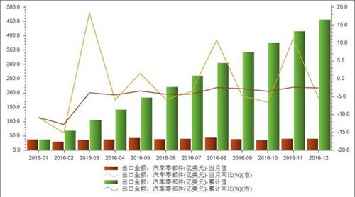 以下為2016年1月至12月我國汽車零部件出口金額統計: