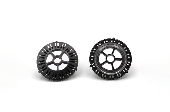 該零件結構相當復雜,呈圓形,邊緣周圍有30個窄通孔槽,還有5個肋條狀結構與中心孔相連。與此前采用的機械加工和線切割工藝相比,金屬注射成形(MIM)工藝使成本降低了 40%。